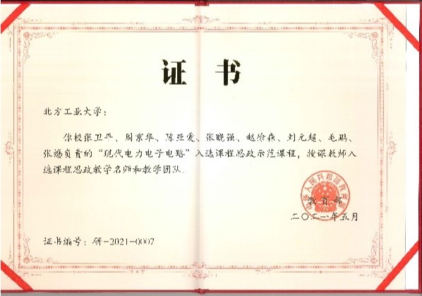 以课程实验负责人身份,赵徐森同志参与完成的教学成果“电力电子学(系列)课程体系的改革和探索”获得北京市高等教育教学成果一等奖,“现代电力电子电路”课程入选教育部课程思政示范课程,“电力电子技术基础”课程被评为北京市和国家精品课。2020年设计的实验教学案例获得第七届全国高校电工电子基础课程实验教学案例设计竞赛华北赛区二等奖。