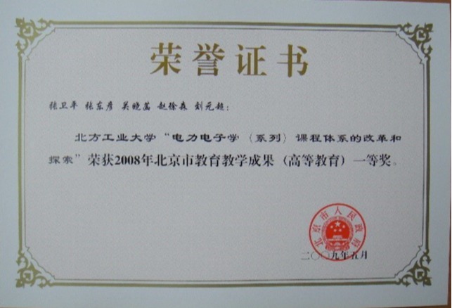 以课程实验负责人身份,赵徐森同志参与完成的教学成果“电力电子学(系列)课程体系的改革和探索”获得北京市高等教育教学成果一等奖,“现代电力电子电路”课程入选教育部课程思政示范课程,“电力电子技术基础”课程被评为北京市和国家精品课。2020年设计的实验教学案例获得第七届全国高校电工电子基础课程实验教学案例设计竞赛华北赛区二等奖。